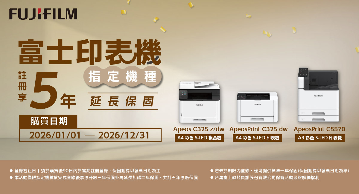 | Apeos / ApeosPrint C325系列 | 標準一年2025/1/1後購買 登錄通過享五年 | 專人到場服務 |